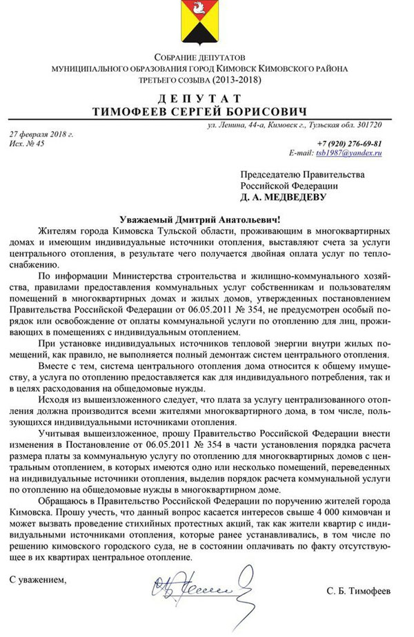 Поводом для «Стихийных протестных акций», по заверениям местного депутата, может стать нерешенность вопросов с двойными квитанциями. Вопросов, на первый взгляд разрешаемых одним звонком в местную управляющую компанию и Горгаз. Но в Кимовске Тульской области, заявляет депутат Тимофеев, счета за централизованное теплоснабжение приходя к установившим индивидуальные отопительные приборы. Сложилась ситуация, при которой людям приходится платить по двум счетам, и с такой проблемой столкнулись порядка 4 000 жителей.