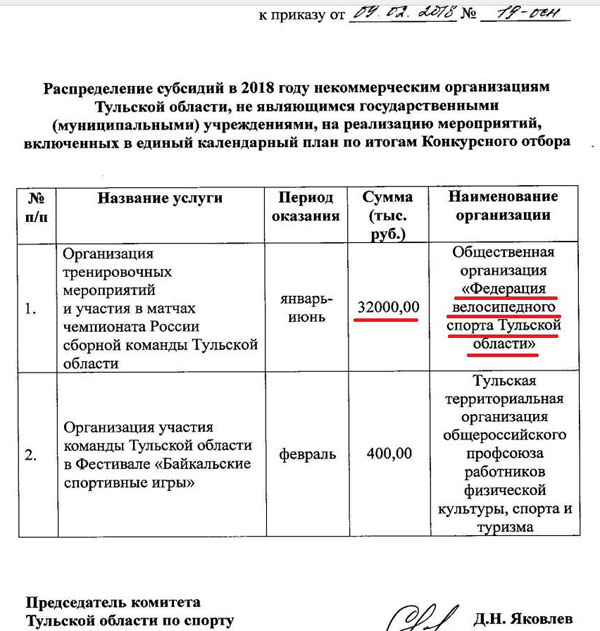 Несмотря на полную непрозрачность, конкурс видимо состоялся, а право на субсидию из областного бюджета в размере 32 млн рублей получила общественная организация «Федерация велосипедного спорта Тульской области«: