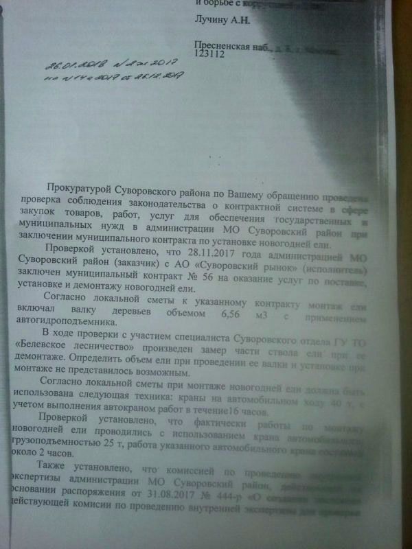 Проверка показала, что фактически монтаж ели осуществлялся с помощью крана грузоподъёмностью 25 тонн за 2 часа, тогда как должна была — за 16 часов и краном грузоподъёмностью 40 тонн. Однако чиновники «забыли» отразить это в акте внутренней экспертизы.