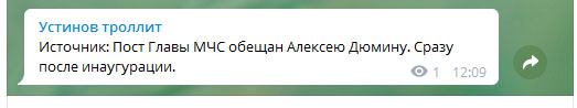 По имеющимся у нас сведениям, кандидатура Алексея Дюмина вполне устраивает основателя ведомства Сергея Шойгу.