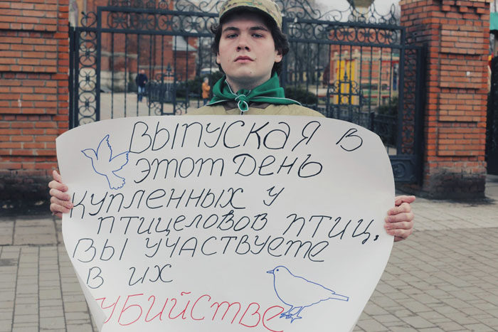 — Пикет нужен для того, чтобы «Правила объектов животного мира, не отнесенных к охотничьим ресурсам Тульской области» вступили в законные права, — объясняет Екатерина Олейник, одна из организаторов мероприятия. — Это поможет сохранить жизнь большому количеству лесных птиц, которых в Благовещение «выпускают» на волю. Мало кто знает, что перед Благовещением пернатых нелегально отлавливают в лесах и держат в ужасных условиях до дня продажи — тесные клетки, полное отсутствие еды и воды, антисанитария. Большинству особей браконьеры намеренно подрезают крылья, чтобы птицы не имели никакой возможности улететь далеко от места продажи. Горожане, покупающие очередную птицу якобы «чтобы выпустить по традиции», по факту участвуют в процессе умерщвления несчастных существ — отпускают уже критически ослабленных, травмированных птиц буквально на смерть. Из десятков тысяч птиц, распродаваемых в Благовещение, выживают лишь единицы…