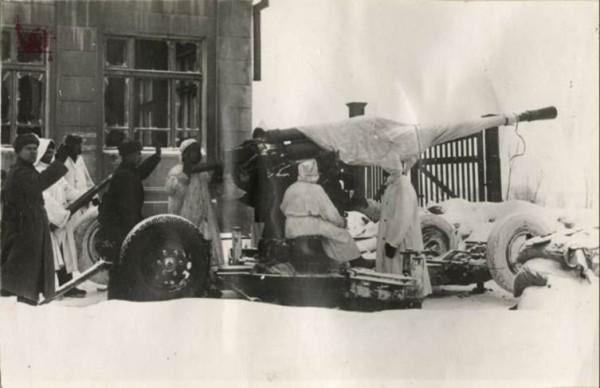 Кстати вот та самая фотка с зениткой у двадцатой школы (стырил в инете, автора не знаю). В то время — окраина Тулы. Отсюда наши деды шмаляли по фашистким танкам и в этой же школе был полевой госпиталь.