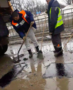 ХХІ век, а воду из ям убирать так и не научились? Перед тем, как заляпать яму асфальтом, нужно убрать воду и грязь и высушить.