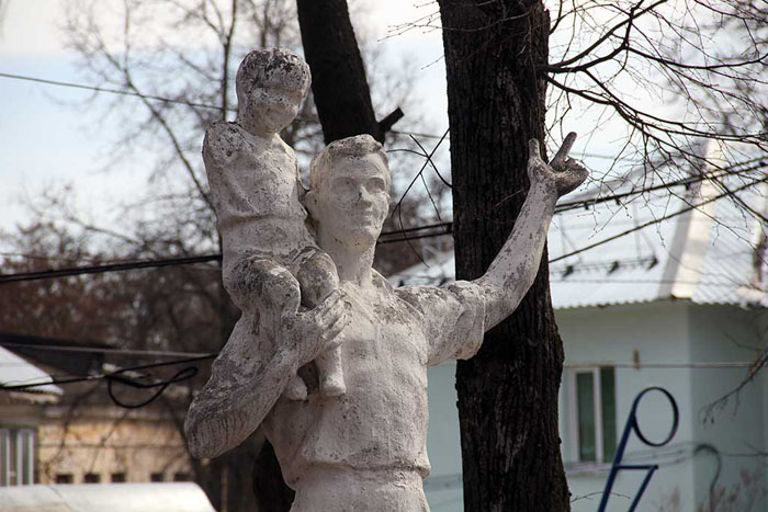 Продолжая экскурсию по Липкам, я и мой провожатый выходим к местному дворцу культуры. Дети увлеченно наматывают круги по главной площади города. Взрослые, разнежившись под весенним солнцем, лениво покрикивают на особо разогнавшихся чад. Полному умиротворению от созерцания такой картины мешают грязные и местами поломанные скульптуры. Их в Липках сотни. Кажется, через десяток лет только они одни и останутся в этом городке.