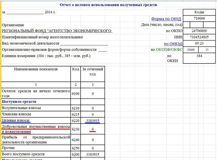 Никаких других средств в 2014 году в фонд не поступало, что подтверждает цифра «0» в строке «Добровольные имущественные взносы и пожертвования».