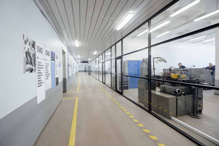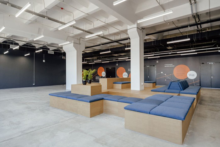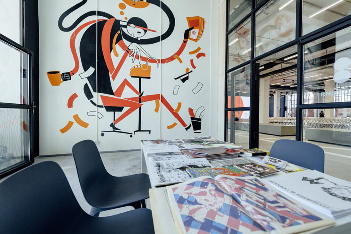 Монотонность урбанистического интерьера раскрашивают яркие детали. У каждого рабочего пространства свои акценты и индивидуальность. В библиотеке — желтые тумбы, в большом зале — белые модели станков вдоль панорамных окон. Оранжевый цвет уже был в экстерьере здания: до того, как началась реконструкция, его можно было встретить на вытяжках и вентиляции. Архитекторы развили идею внедрения цвета и добавили яркую наружную лестницу, ведущую из двора кластера на открытую веранду. Вероятно, она символизирует движение вверх, максимально привлекает внимание и уже мелькает в инстаграм-аккаунтах местной молодежи.