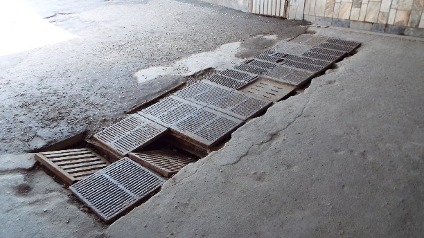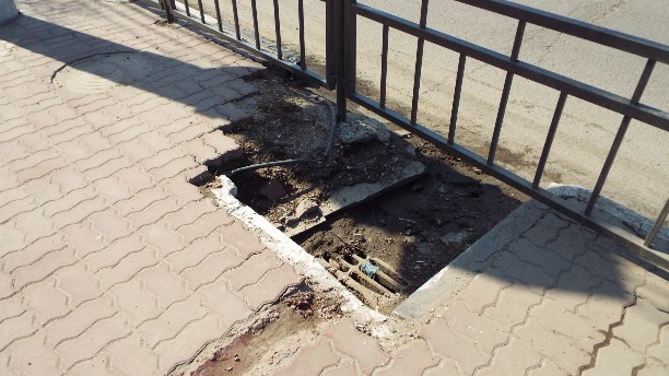 3) Перед Городским Концертным Залом решетка от ливневой канализации провалилась и держится на «кирпичах». Можно загреметь под фанфары в буквальном смысле.