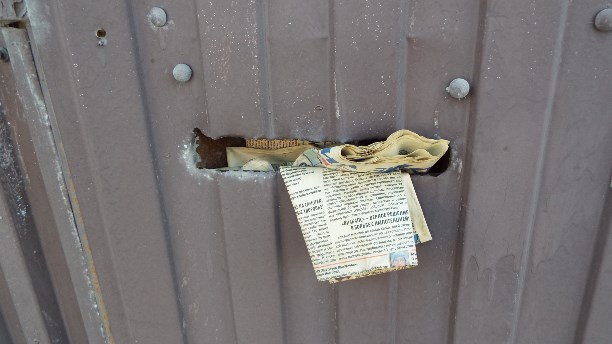 В деревянном частном доме почтовый ящик организован с помощью дыры в заборе (или двери). Крышки у ящика нет, ящиком давно никто не пользуется, и из него торчат старые газеты.