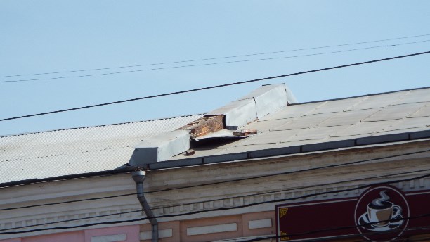 11) А вот это место может принести новость про смерть. И это не шутка! Посмотрите, на наклонной и скользкой крыше дома лежат кирпичи. Наверно этими кирпичами кто-то заботливо прижал оторванный в смерч лист жести. Что сказать? … гении (НЕТ!) … Следующий ураган начнёт трепать эту жесть из-за её парусности, и жесть может сбросить кирпичи на тротуар…. а там рядом остановка ОТ и выходы из магазинчиков и кофеен.