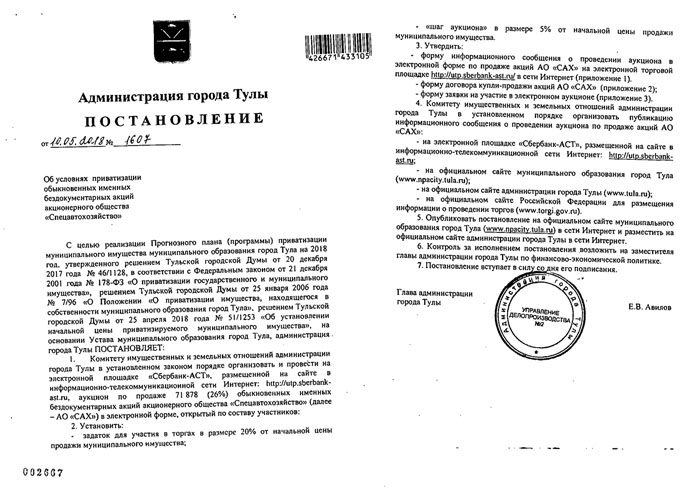 Как стало известно «Тульской прессе», 26% акций АО «Спецавтохозяйство» планируют продать на аукционе.