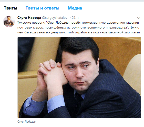 Так он отреагировал на сообщение наших коллег о том, что «Олег Лебедев провёл торжественную церемонию гашения почтовых марок, посвящённых истории отечественного пчеловодства».