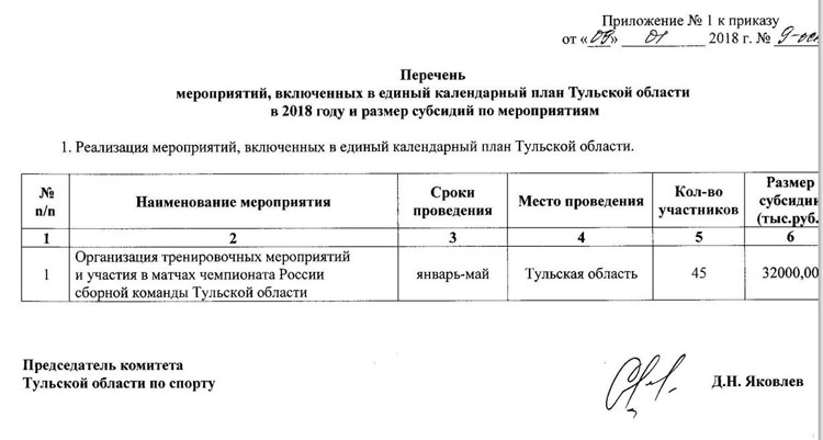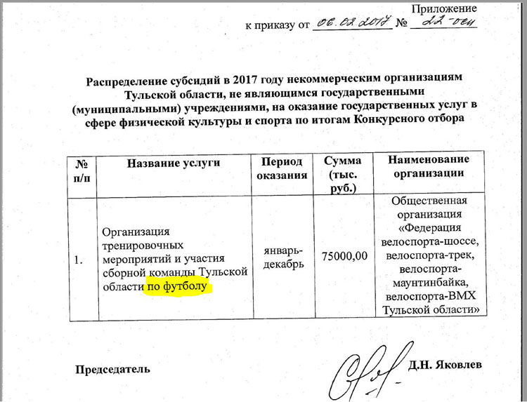Так, что в прошлом году 75 млн бюджетных рублей были выделены «Федерации велоспорта-шоссе, велоспорта-трека, велоспорта-маунтинбайка, велоспорта-ВМХ Тульской области» якобы по итогам конкурсного отбора для мифической сборной команды области по футболу: