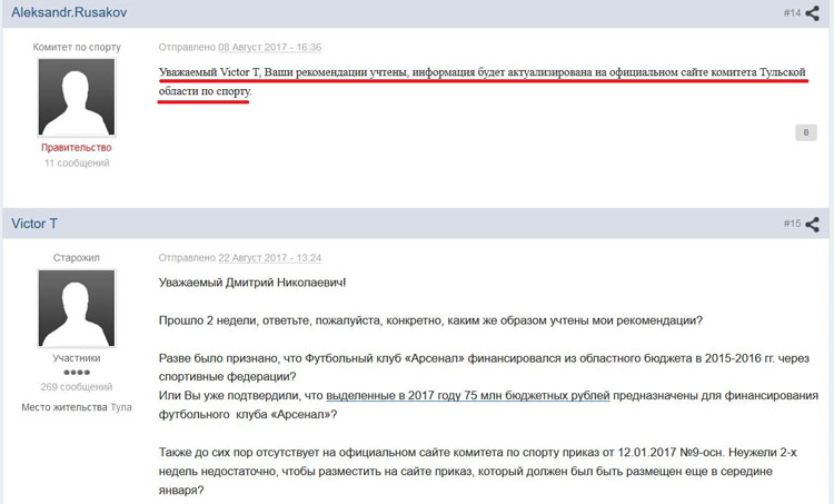 — Предполагал, что такой ответ возможен, поэтому указал конкретные факты, свидетельствующие о недобросовестных действиях областного комитета по спорту, на которые Вы, к сожалению, не обратили внимание. И конечно, прежде чем беспокоить Вас, ознакомился с Положением о контрольном комитете Тульской области.