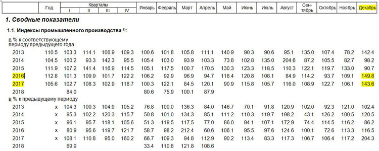 Чтобы получить за год 105,6%, имея за 11 месяцев 102,4%, необходимо, чтобы в последний месяц – декабрь 2017 года был очень высокий прирост производства по сравнению с декабрем 2016 года. И действительно, статистика, не смущаясь, выдает индекс промпроизводства (декабрь 2017г к декабрю 2016 г) аж 143,6%.