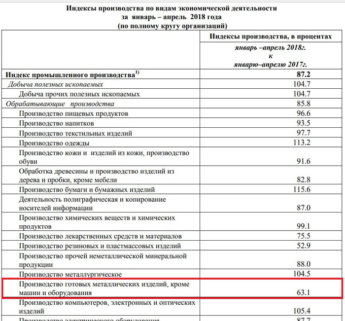 Конечно, это лишь предположение. Но если посмотреть индексы производства по видам экономической деятельности за январь-апрель 2018 года, то сразу бросается в глаза падение производства готовых металлических изделий, кроме машин и оборудования по сравнению с аналогичным периодом прошлого года на 37%: