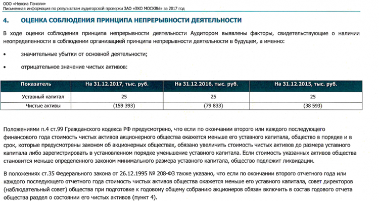 Итак, вот что пишут в аудиторском заключении за 2017 год аудиторы Эхо Москвы из компании «Нексия Пачоли». По подсчетам аудиторов на 31.12.2015 чистые активы Эха Москвы составляли минус 38,59 миллионов рублей, на 31.12.2016 — уже минус 79,83 миллиона рублей, а 31.12.2017 — уже минус 159,39 миллиона рублей, то есть Эхо Москвы не просто работает в убыток — а оно уже кинуло в топку даже те деньги, которых у них не было. По большому счету эту компанию уже нужно ликвидировать, причем даже не с точки зрения здравого смысла и финансовой логики, а с точки зрения требований российского законодательства. Даже аудиторы, нанятые самим Эхо Москвы, указывают в своем заключении на положения п. 4 ст. 99 Гражданского кодекса РФ и подчеркивает: «Если стоимость чистых активов общества становится меньше определенного законом минимального размера уставного капитала, то общество подлежит ликвидации».