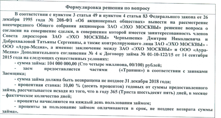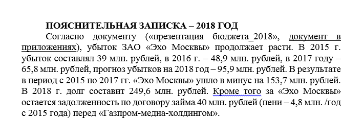 Из полученных документов можно сделать однозначный вывод, что Эхо Москвы существует последние три года исключительно благодаря денежным вливаниям от структур «Газпрома». На компании Венедиктова до сих пор висит задолженность по договору займа 40 млн. рублей (пени – 4,8 млн. /год с 2015 года) перед «Газпром-медиа-холдингом». Ситуация с финансами в будущем не улучшится, потому что предполагаемый «минус» за 2018 год составит примерно четверть миллиарда рублей.