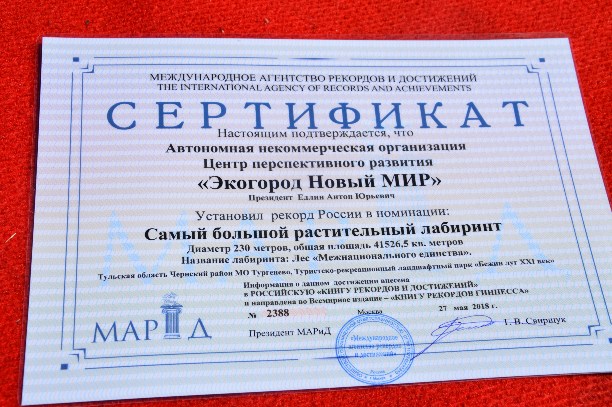 В нём указано, что установлен рекорд в номинации «Самый большой растительный лабиринт». Хотя специально посаженных деревьев, кустиков, цветов и трав на грядках на тот момент было совсем немного…