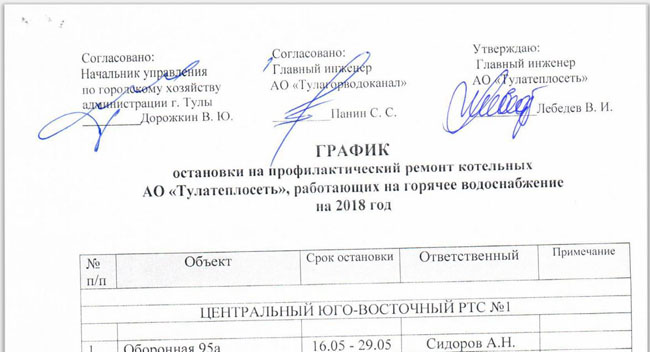 А вот в АО «Тулатеплосеть» повели себя достойнее, чем городские чиновники: не испугались и в графике, размещенном на своем официальном сайте, указали конкретные сроки, причем установленные с очевидным нарушением федеральных и областных норм: