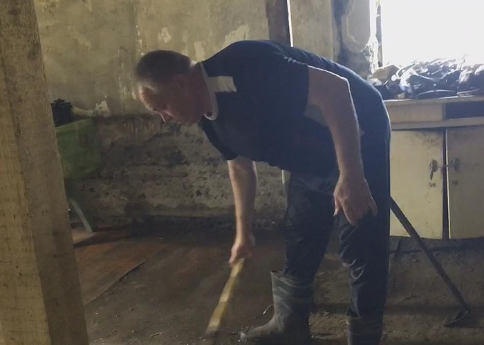 Мы продолжаем убеждать помятого ворчуна все-таки поговорить с нами. Тут он, отталкивая нас и, сыпля проклятиями, выбегает из домика. Лай собаки на секунду прекращается.