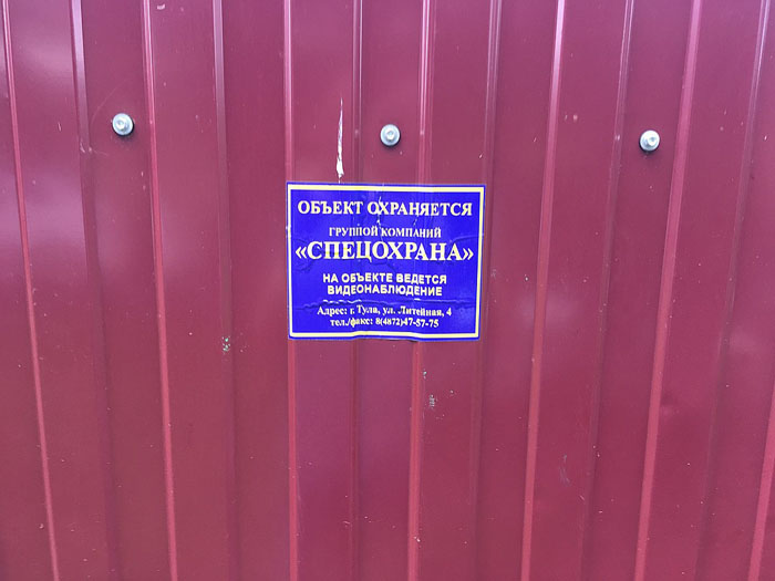 Следующая наша остановка — «приют» для бизнесменов в заточении. Перед нами гигантский забор, на котором красуется грозная наклейка: «Дом охраняется группой компаний «СПЕЦОХРАНА». И даже телефон чоповцев имеется. Правда, на том конце трубки никто не отвечает.