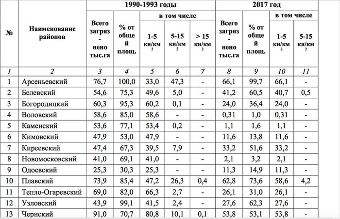 О том, какой урожай на этих же землях собирали в начале 90-х говорит один только факт — площади загрязнения тогда достигали 100% от общих площадей муниципальных образований. Правда, до сих пор остаются территории, где все совсем плохо: Арсеньевский, Плавский, Чернский районы. Детальная ситуация отражена в таблице.