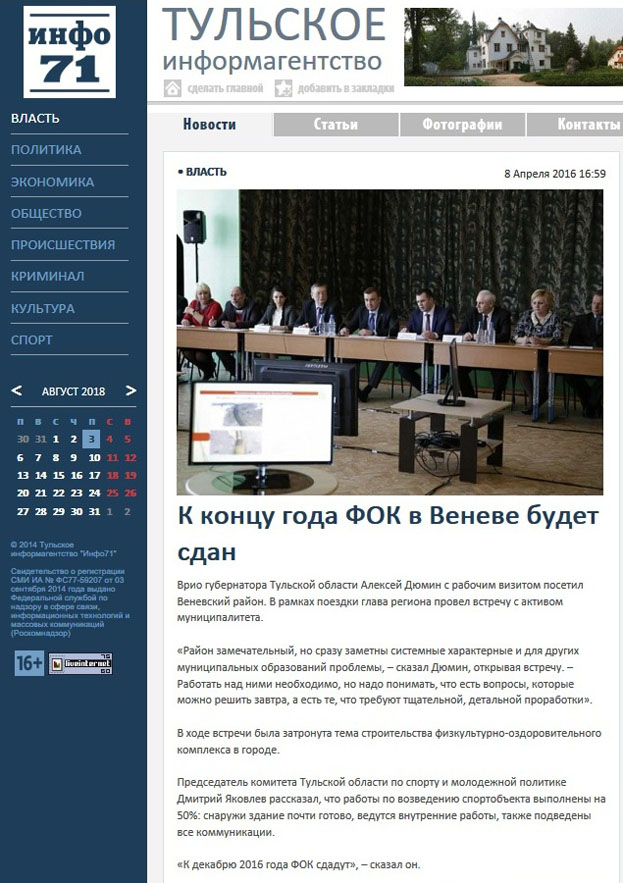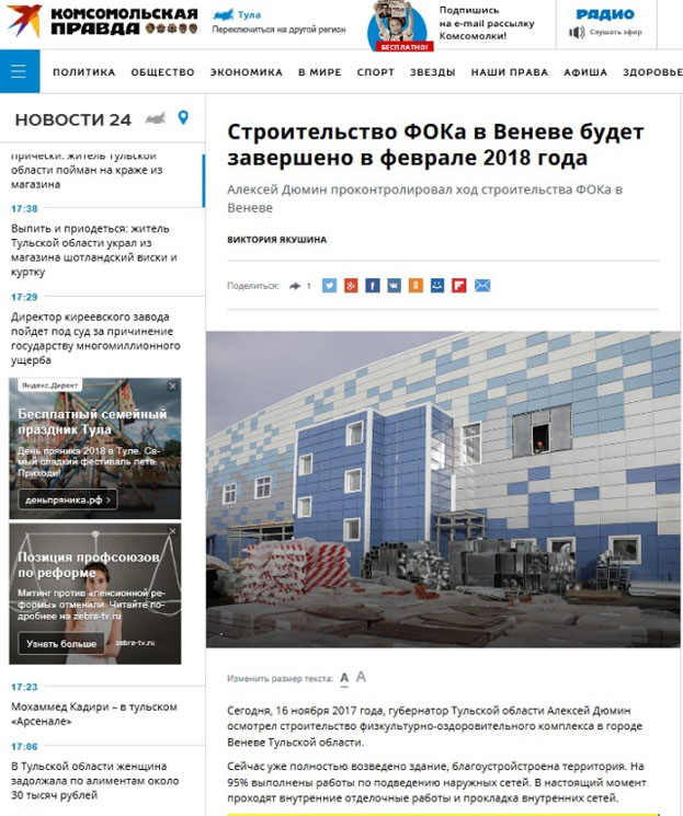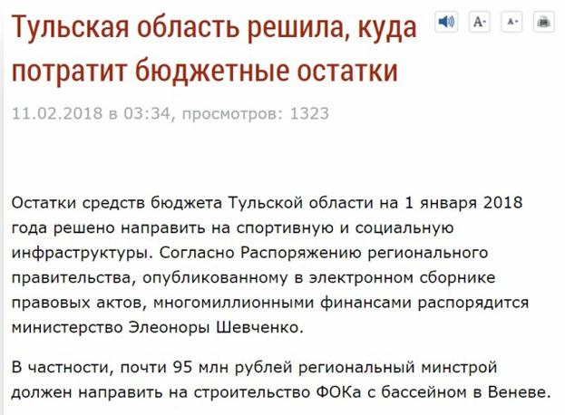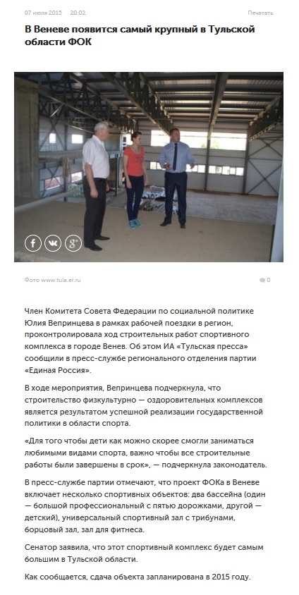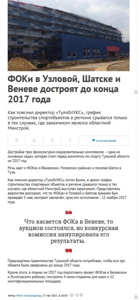 Но комизм ситуации не в этом, а в том, что нужен ли очередной ФОК в Тульской области, который будет пустовать под замком после открытия. И где стюардесса денег возьмет на его содержание — в бюджете районном даже на баню денег нет. А ведь плптить надо и за тепло и за вола и за электричество, да еще охране, которая этот неработающий ФОК охранять будет.
