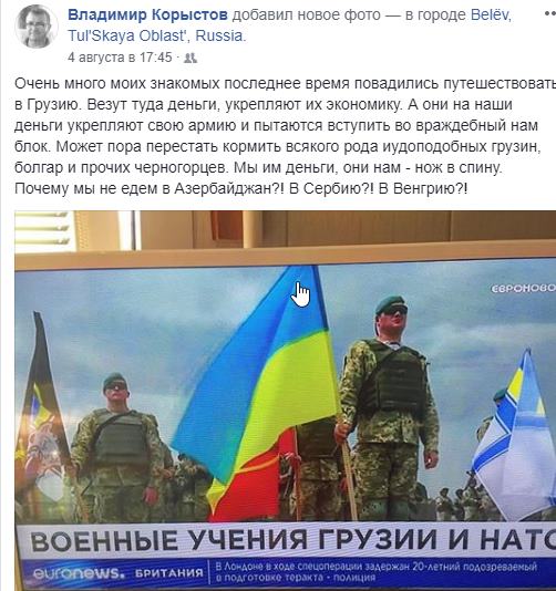 «Очень много моих знакомых последнее время повадились путешествовать в Грузию. Везут туда деньги, укрепляют их экономику. А они на наши деньги укрепляют свою армию и пытаются вступить во враждебный нам блок. Может пора перестать кормить всякого рода иудоподобных грузин, болгар и прочих черногорцев. Мы им деньги, они нам — нож в спину. Почему мы не едем в Азербайджан?! В Сербию?! В Венгрию?!» — написал он на своей странице в фейсбуке.