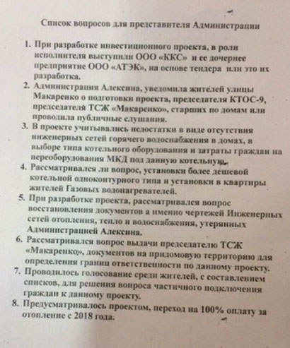 Также алексинцы опубликовали «список вопросов» по итогам собрания с представителями администрации, которое прошло 17 августа.