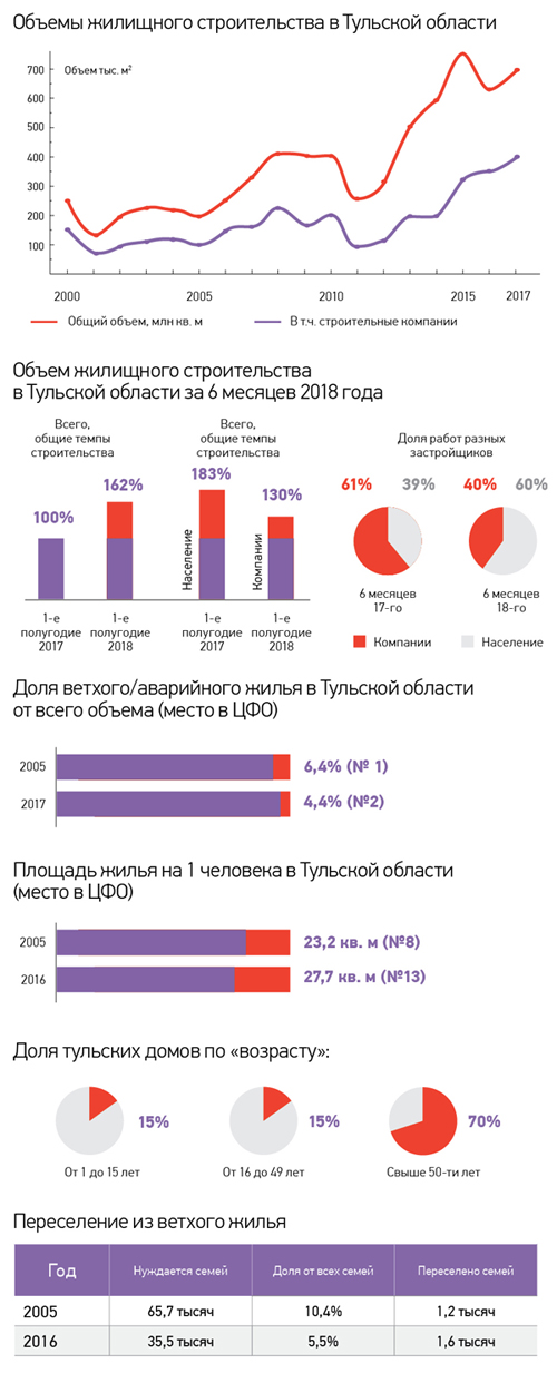 В 2005 году в Тульской области весь жилой фонд составлял 37,0 млн кв. метров. Всего на 1,5 млн больше, чем в 80-е годы ХХ века. Тем не менее 4-я позиция в ЦФО. Впереди — столица, Подмосковье, Воронежская область. И тогда на одного жителя региона приходилось по 23,2 «квадрата». В масштабах ЦФО это было 8-е место. Для сравнения: в Москве показатель был 16,6 кв. м, в большинстве стран Европы — 30–60, в США — 120–130, в Палестине и Индии — по 3,5–5,0 кв. м.