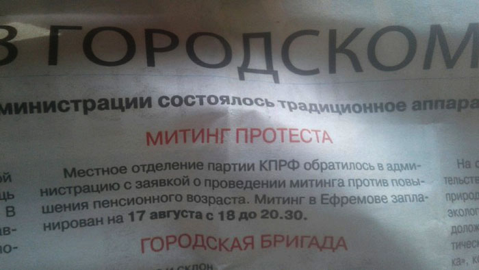 «Вот информация о митинге против повышения пенсионного возраста , опубликованная в районной ефремовской газете „Панорама Красивомечья“. На первый взгляд ничего необычного. Газета пишет о важнейшем общественно-политическом мероприятии города.