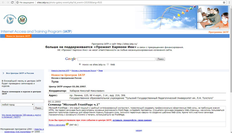 «Программа IATP и сайт http://sites.iatp.ru/ больше не поддерживается «Прожект Хармони Инк» в связи с прекращением финансирования. НК «Прожект Хармони Инк» не несет ответственности за любые несанкционированные изменения сайта».