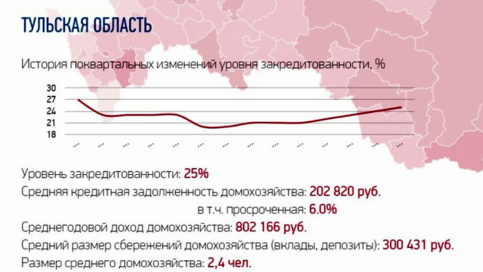 Так, средняя российская семья должна банку 234 тыс. рублей — на 19% больше, чем годом ранее. Для Тульской области этот показатель составляет 202 тыс. рублей, также отмечается тенденция роста закредитованности.