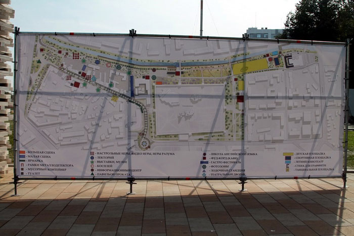 На каждом входе на Набережную (уже можно писать с большой буквы) стоят вот такие информационные щиты. Инфографика на банере нормальная, в принципе понятная. Меня выбесило само исполнение — на каких-то ржавых стойках, стажках и подпорках. Это дичайший колхоз!