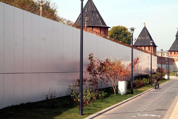 Бетонный забор ФСБ облагородили композитными панелями. Отличное решение. Главное чтобы п****асня с аэрозольными балончиками его не расписала похабщиной.А это (как оказалось) туалеты! Внутрянку проинспектировать пока не смог, заметил это сооружение в последний момент, снаружи нет никаких указателей. И это хреново, граждане. Ну, напишите на стеночках «Мэ» и «Жо», от вас, что, убудет? А такие слепошарые как я — заметят. Другой раз обязательно проинспектирую внутрянку — готовьтесь!