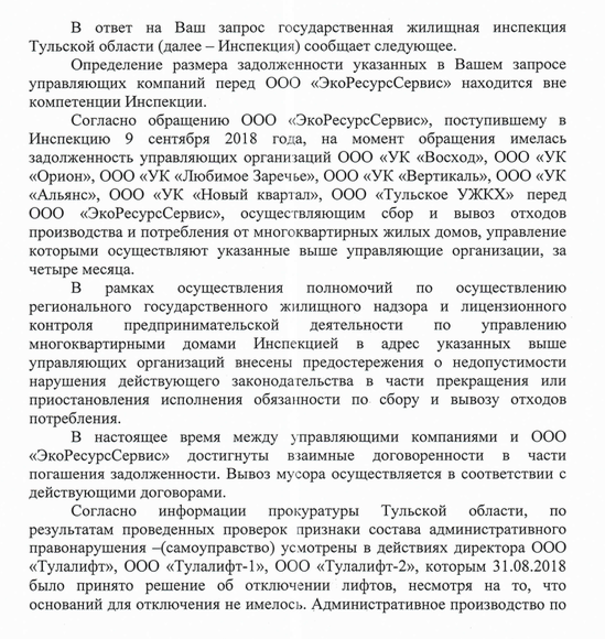 В настоящее время между управляющими компаниями и ООО «ЭкоРесурсСервис» достигнуты взаимные договоренности в части погашения задолженности. Вывоз мусора осуществляется в соответсвии с действующими договорами» — прокомментировал сложившуюся ситуацию начальник ГЖИ по Тульской области Леонид Ивченко.