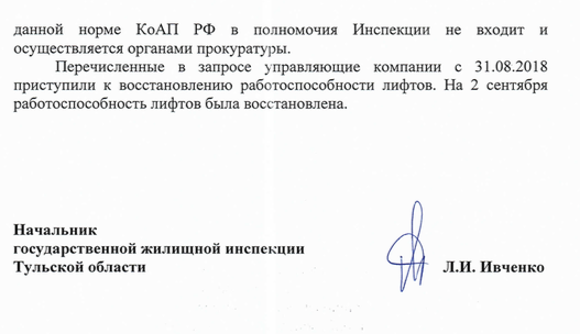 Прокурорская проверка, проведенная после отключения, показала, что виноваты буквально все — и руководство «Тулалифта», и Государственная жилищная инспекция, и, само собой, управляющие компании. Однако причина расторжения договоров управляющих компаний с «Тулалифтом» так и не была раскрыта. За ответом «Тульская пресса» обратилась напрямую в «ПИК-Комфорт».