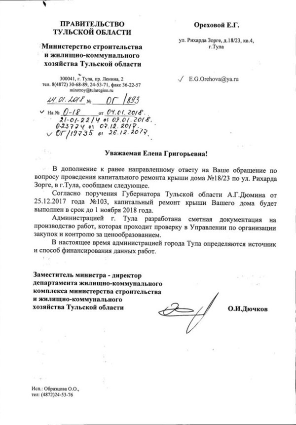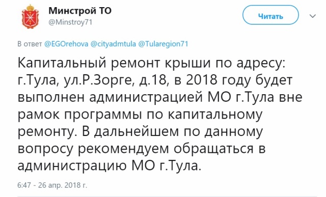 В министерстве строительства и ЖКХ Тульской области объяснили, что крышу будут ремонтировать вне рамок программы капитального ремонта.