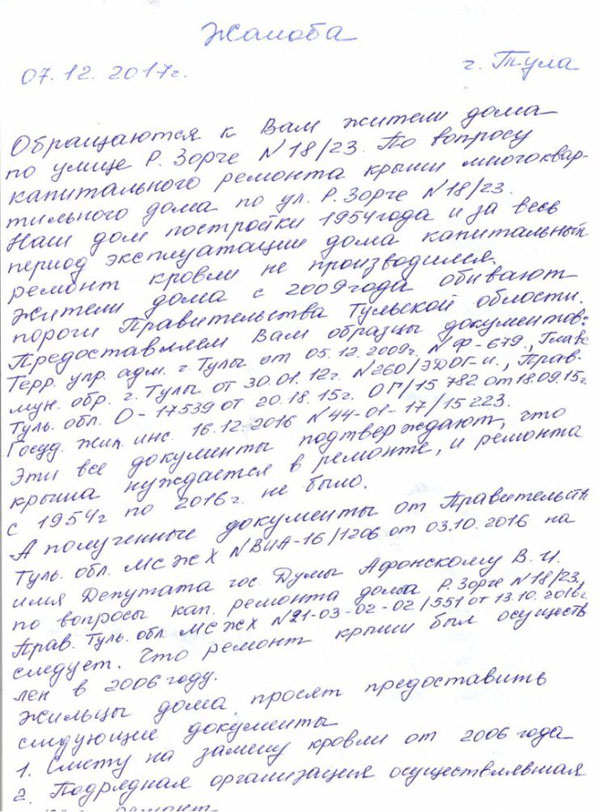 Туляки жаловались, что ремонта в их доме не было ни разу — с 1956 года. Ещё в 2012 году они обращались к главе администрации Тулы Евгению Авилову по вопросу включения их дома в программу капремонта, чиновник обещал рассмотреть вопрос.