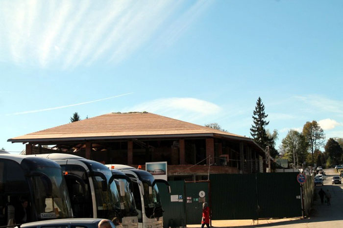Прямо за парковкой, в болотине, делают септики для приезжающих туристов. Я так понял, что вот эти ёмкости это будут говноприёмники. Поскольку тут болотина (это нижняя точка с этой стороны дороги) то мне уже заранее страшно за результат. Не приведи господь они их тут (в болотине) попытаются закопать. Я однажды видел как топливную цистерну выдавило из земли. Надеюсь тут такой глупости не натворят.Сразу за парковкой для туристических автобусов строят новый комплекс. Как написано в сопроводиловке, это будет центр приёма и обслуживания посетителей. Написано, что сдача объекта в декабре 2018. Судя по состоянию стройки — не успеют. Да и качество строительных работ не внушает.