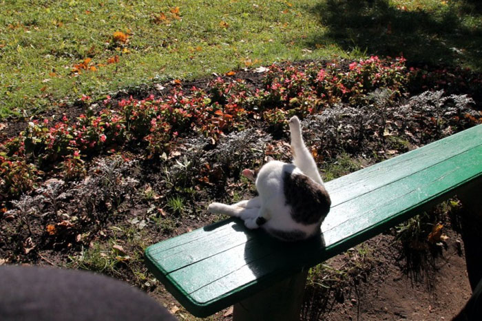 Кстати, будучи тут в гостях, помните, коты тут заласканы до полного акуения. Их тут все чешут и подкармливают беспрерывно. От этого котаны борзеют и теряют берега напрочь! Лезут общаться вообще ко всем! Люди теряют бдительность и попадают в цепкие мохнатые лапки, считай рабство. Потом не выберетесь!