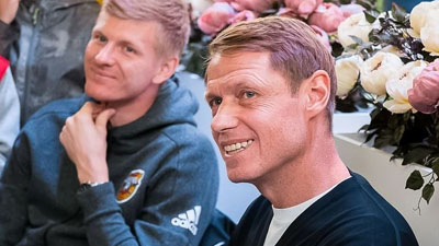 25 октября. Тула. Олег Кононов (на переднем плане) и голкипер Михаил Левашов на встрече с болельщиками. Фото instagram.com/pfcarsenaltula/