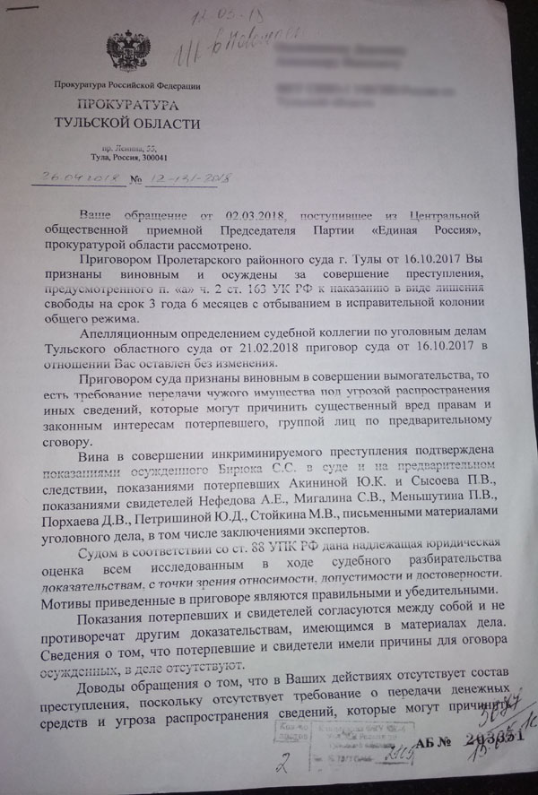 P.S. Любопытно, что в рамках дела о «вымогательстве» вскрылись факты о том, кто оплачивает угнанный у его создателей интернет-ресурс, на котором в последнее время активно «мочат» Алексея Дюмина и Романа Праскова. По удивительному совпадению там есть «пересечения» с угоном в офшор стратегического предприятия «Тулагорводоканал». Но об этом — в другой раз.