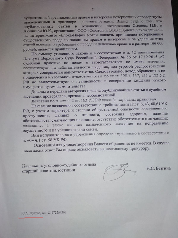 Но Юлия Жукова не сдается (2-й абзац, 2-й страницы): «По смыслу уголовного закона и в соответствии с п.12 постановления Пленума Верховного Суда Российской Федерации №56 от 17.12.2015 «О судебной практике по делам о вымогательстве» не имеет значения, соответствуют ли действительности сведения, под угрозой распространения которых совершается вымогательство (Ещё раз. К моменту «вымогательства», которое не смогла засечь даже аппаратура оперативников, ВСЕ СВЕДЕНИЯ В ОТНОШЕНИИ ПОТЕРПЕВШИХ УЖЕ БЫЛИ РАЗМЕЩЕНЫ, Т.Е. РАСПРОСТРАНЕНЫ — «Блоха-Инфо»). Следовательно, довод обращения о не привлечении к уголовной ответственности по ст.ст. 128.1, 137, 155 и 183 УК РФ не свидетельствует о невиновности в совершении ХИЩЕНИЯ чужого имущества путем вымогательства»».(См. фотокопию документа).