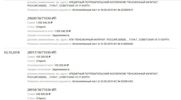 Официальной информации о продвижении дела пока нет, однако в реестре ЕГРЮЛ сообщается о 74 исполнительных производствах в отношении КПК «Пенсионный Капитал», из них 69 открытых на сумму 22 724 487,05 рублей. Остаток непогашенной задолженности: 22 724 487,05 рублей.