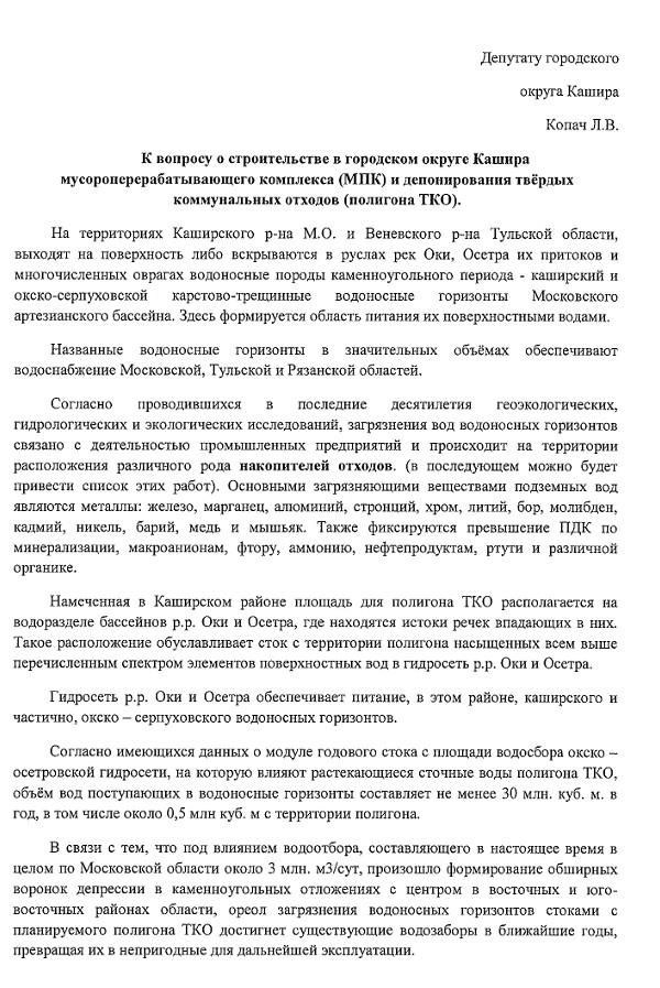 «Политика нашего государства направлена на возрождение сельского хозяйства, но слова расходятся с делом. С 3-х сторон предлагаемого места для полигона располагаются земли сельскохозяйственного назначения, которые вспаханы. Вместо того чтобы использовать сельскохозяйственные земли по назначению, нас пытаются завалить мусором со всех регионов. Уже имеется негативный опыт жителей г. Ожерелья, у которых из-за близкого расположения к жилой зоне (менее 1 км до г. Ожерелье) и отсутствия современных систем очистных сооружений у полигона ТБО „Каширский“ увеличилась заболеваемость детей лейкозом и другими формами рака, что приводит к смертельному исходу. Если завод будет предусматривать мусоросжигание, то отравляющее воздействие диоксинами может распространиться на территорию до 25 км. Отсутствует опубликованный должным образом документ „Оценка воздействия на окружающую среду“ (ОВОС) с приложениями, которые являются объектом последующей экологической экспертизы. Общественные слушания по строительству полигона ТБО не проводились. Планируемое место под отведение полигона ТБО расположено в менее чем 500 метрах от границ населенного пункта, а именно деревни Залесово. В данной местности находятся источники рек и ручьев, впадающих в Оку, грунтовые воды лежат неглубоко и часто выходят в виде ключей и родников. Леса и луга в долинах рек Смедова и Любинка относятся к заказникам», — говорится в обращении.