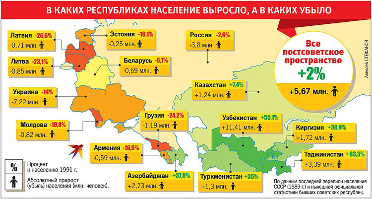 По пространству интернета ходит очень показательная карта бывшего СССР — с цифрами: сколько каждая из бывших советских республик за годы независимости потеряла или приобрела населения. Согласно этим данным, устремленные в Евросоюз республики лишились до четверти своего народа. А азиатские в это время ударно росли. И лишь Россия осталась «при своих». Почему так произошло?