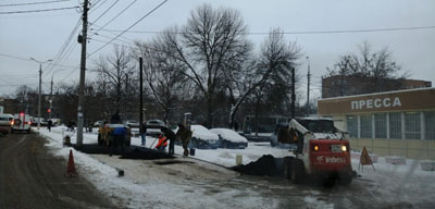 Тульские дорожники укладывают горячий асфальт прямо на заснеженный тротуар