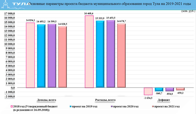 Отметим, прогнозируемые доходы бюджета Тулы на 2019 год составят почти 14,5 миллиардов рублей. Расходы – больше 15,3 миллиардов рублей. Дефицит – 870,7 миллионов рублей.