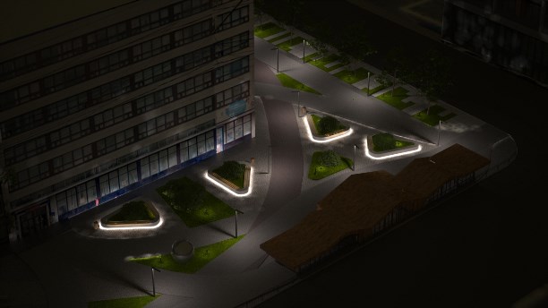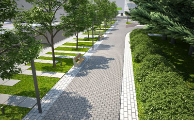 Также предполагаются работы по мощению пешеходной зоны различными видами плитки, обустройству освещения, организации газонов с посадкой деревьев, установке лавочек и урн. В процессе благоустройства планируется и реконструкция фасада хозяйствующего субъекта, расположенного рядом с общественным пространством. Будет реконструирован вход в подземный переход.